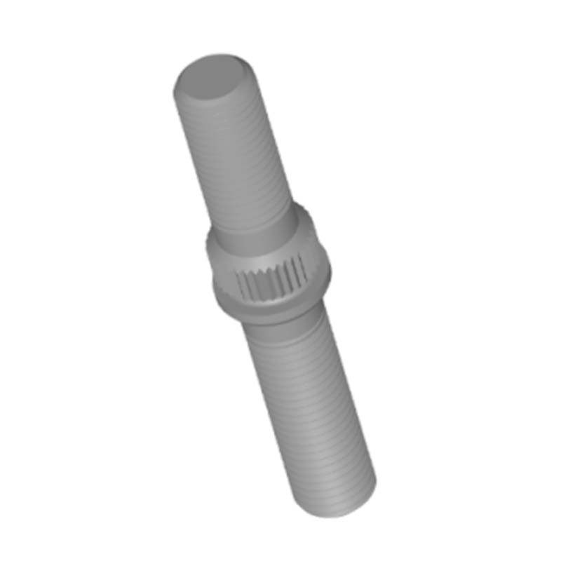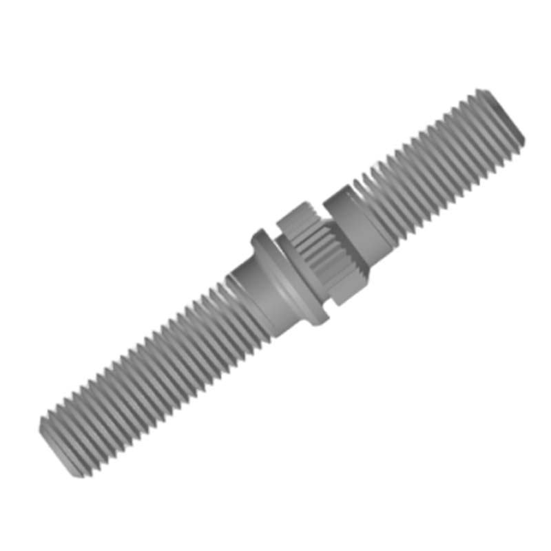 O pino da roda de extremidade dupla e serrilhado tem a forma de uma "haste" cilíndrica reta e é uma estrutura escalonada de diâmetro variável. Ambas as extremidades são processadas com roscas externas e há uma estrutura serrilhada/dentada no meio, o que pode aumentar o atrito.