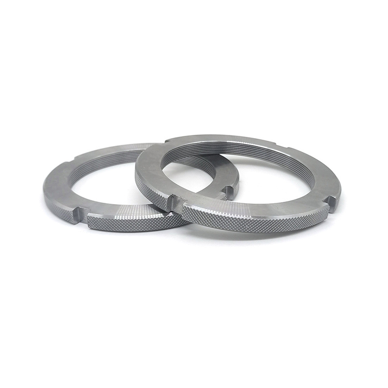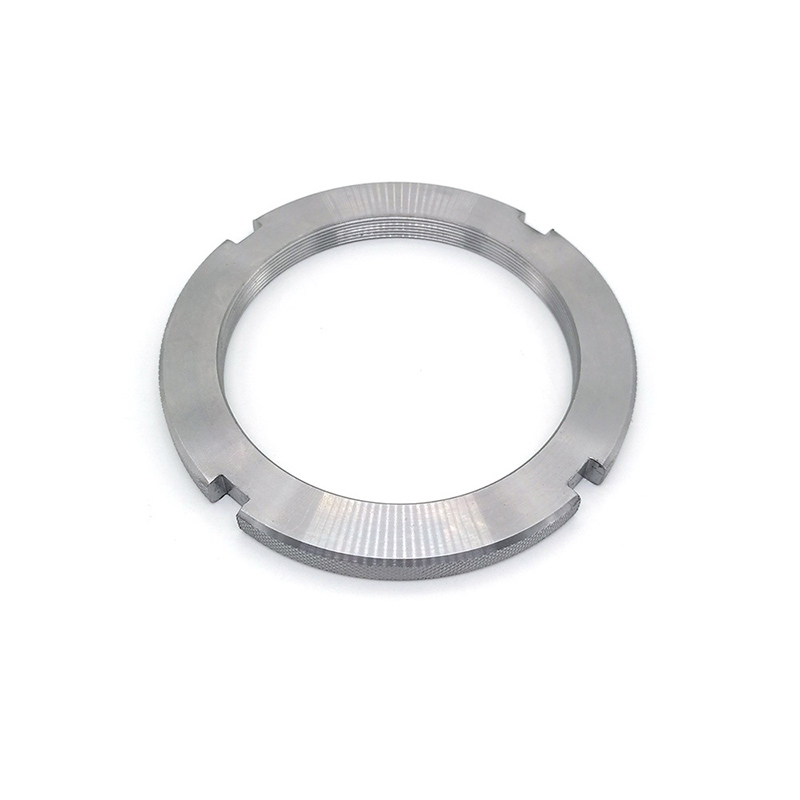 Porcas redondas com fenda totalmente rosqueadas - são definidas de acordo com padrões como DIN 546 e são usadas principalmente para obter uma conexão de fixação segura e podem suportar vibrações. A principal característica dessas porcas está nas ranhuras cortadas em uma das extremidades da porca. Veja como usá-los: Primeiro, aparafuse a porca em um parafuso ou pino pré-perfurado e aperte-a na posição desejada. Após o aperto, alinhe a ranhura com o furo no eixo do parafuso. Finalmente, insira um pino aberto (arruela de pressão) ou linha de segurança através da ranhura alinhada e do orifício do parafuso e, em seguida, dobre as extremidades do pino para garantir um encaixe seguro. Assim, na presença de vibrações, a porca não se soltará.
