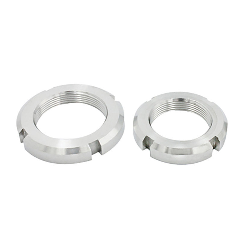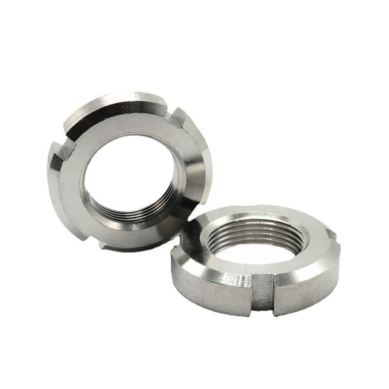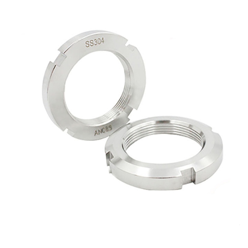 A indústria da construção usa porca redonda com trava com fenda de travamento seguro para conexões de aço estrutural e andaimes - a segurança é a principal consideração. Essas porcas geralmente têm diâmetro maior e são feitas de aço de alta resistência.