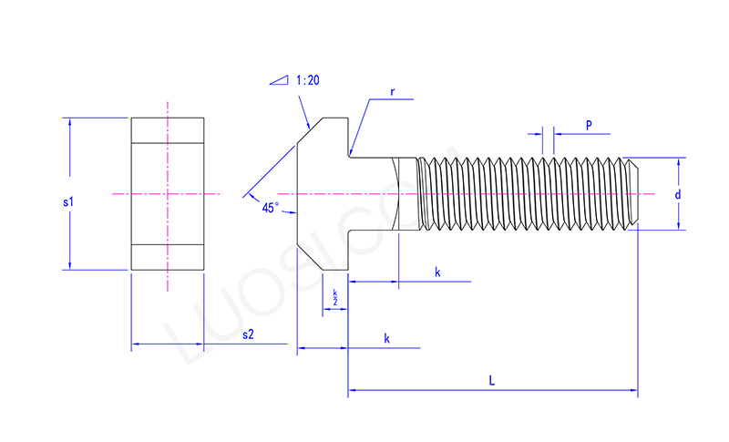 A cabeça do parafuso T do pescoço quadrado é uma forma "T" colocada horizontalmente, assim como a letra "T". Esta cabeça ampla em forma de T permite que o parafuso fique preso na ranhura em forma de T do equipamento, desempenhando um papel na prevenção do parafuso de ser puxado para fora.