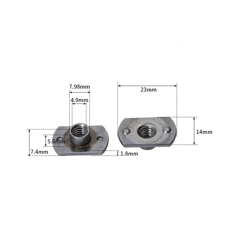 Nossas nozes de solda de estilo T de intransigência padrão são feitas de aço carbono. Os acabamentos protetores usuais são o revestimento de zinco-cromato claro ou amarelo-e eletro-galvanização, que ajudam a impedir que ele enferrujasse.